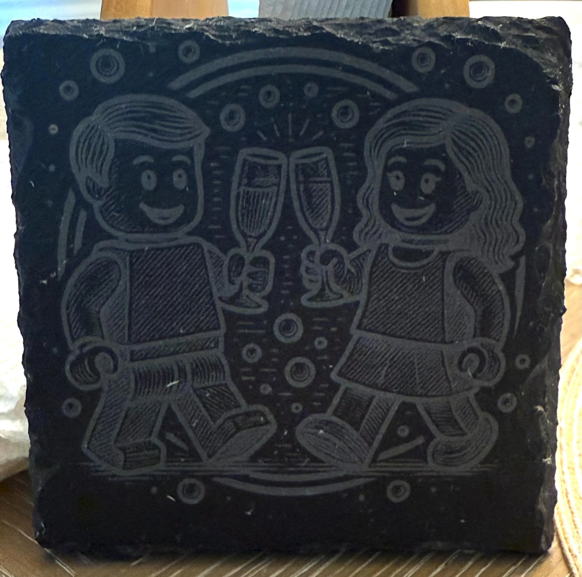Bring a playful twist to your drinks with these engraved slate coasters, featuring Lego-inspired minifig characters raising a toast! Perfect for beer lovers, wine sippers, and cocktail fans alike, each coaster is etched with crisp detail for a look that’s both nostalgic and classy.